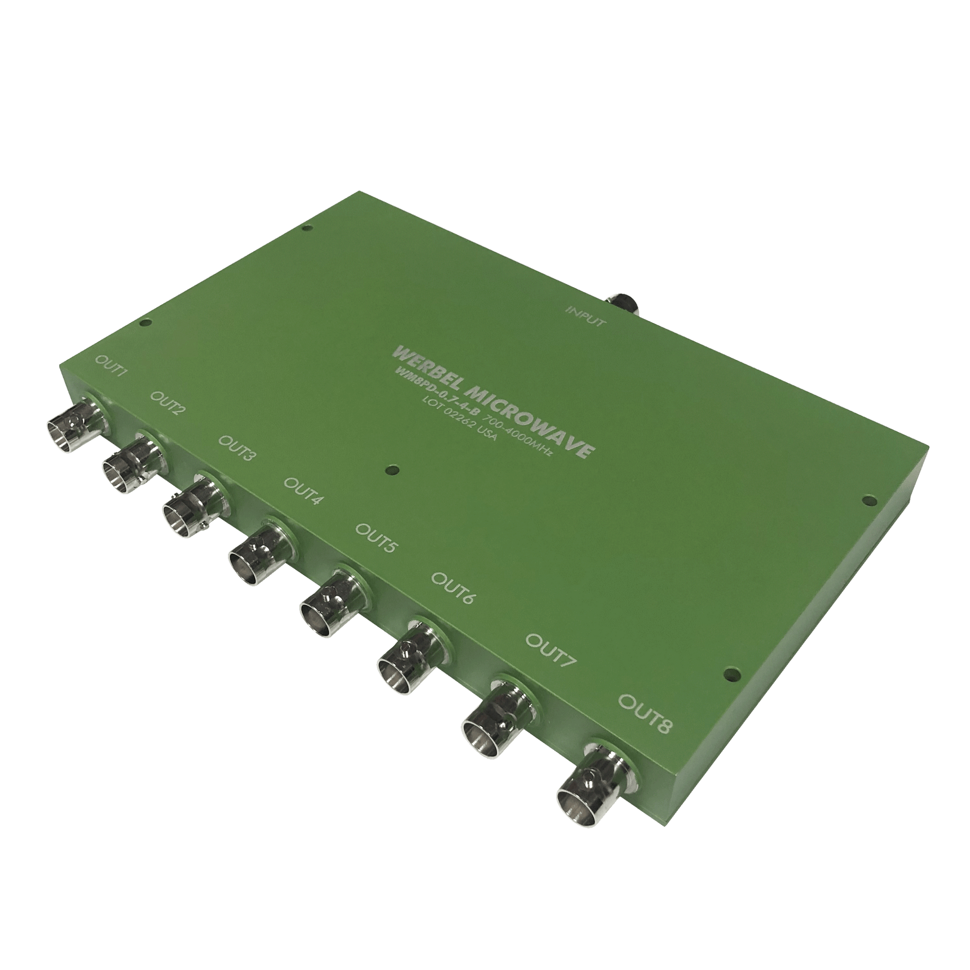 WM8PD-0.7-4-B (formerly known as D-8047-BNC) is an 8-way in-line Wilkinson Power Divider covering 700 MHz to 4 GHz. The unique circuit structure ensures a smooth roll-down beyond 4 GHz to account for frequency drifting near the band edge. Aluminum enclosure measures 7.3â wide x 4.35â deep x 0.75â high, allowing two units to be placed side-by-side in a 19â rack.